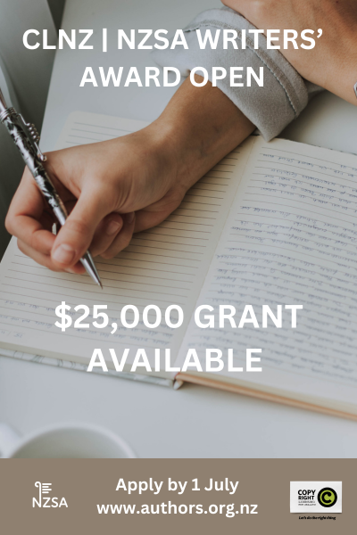 The CLNZ | NZSA Writers’ Award is made possible through Copyright Licensing New Zealand’s Cultural Fund. The Cultural Fund’s objectives are to protect writers and publishers’ ability to earn revenue from their works; support the creation and production of new works and assist the commercial success of New Zealand works; and grow the number of works created and skills in the industry.