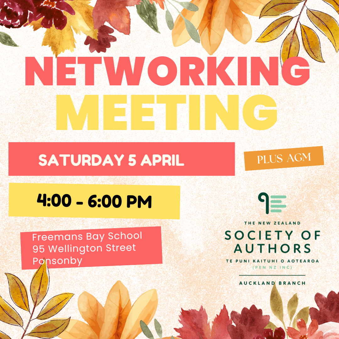 A reminder that calls for nominations for either Auckland Branch chair or secretary positions remain open until 31st March. These will be voted on at our AGM. Please do consider this opportunity to serve your writing community. We’re also very open to new committee members to help guide direction and facilitate events. If you already come to the networking meetings or Zooms regularly, you might be the perfect candidate!