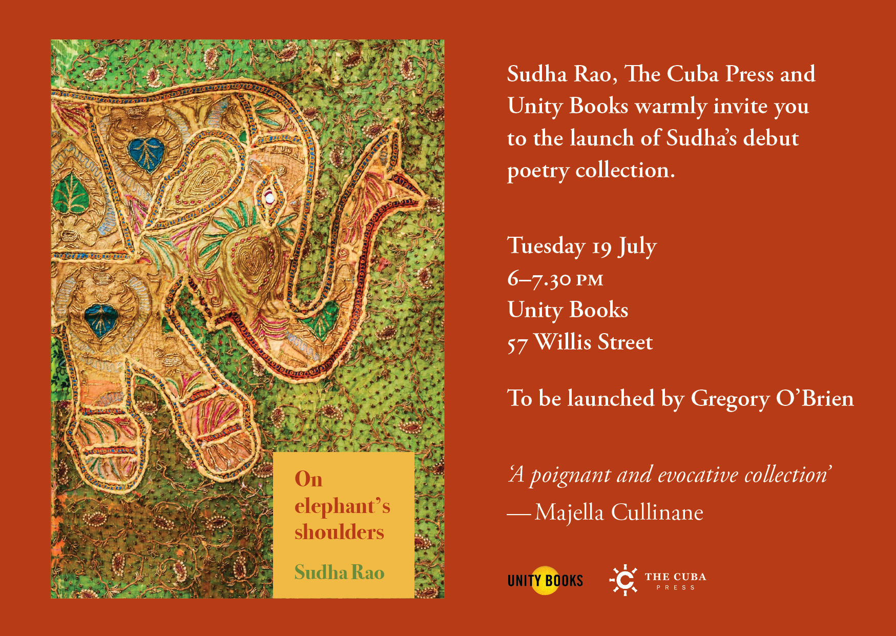 Sudha Rao, The Cuba Press and Unity Books invite you to the launch of Sudha’s debut poetry collection – On elephant’s shoulders.