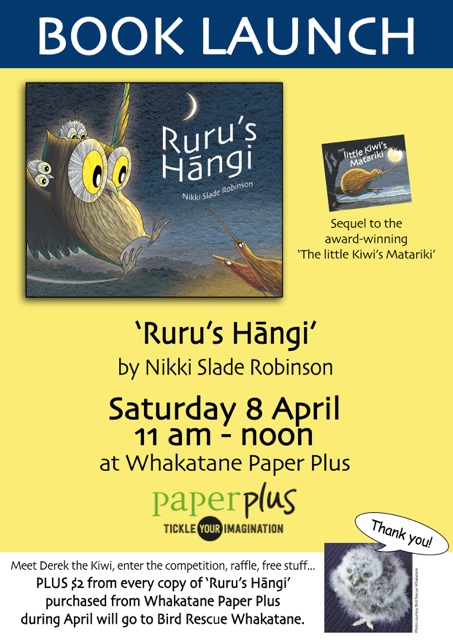 $2 from every copy sold instore during April goes to Whakatane Bird Rescue to help them care for sick and injured ruru (and other feathered friends). Then Easter Sunday from 11am at Apanui School, Whakatane there will be a Kiwi Chick celebration, and ‘Ruru’s Hangi’ and I will also be there 🙂