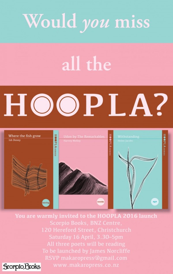 You are warmly invited to the Hoopla 2016 launch, at Scorpio Books BNZ Centre, 120 Hereford Street, Christchurch, Saturday 16th April, 3.30 to 5pm.