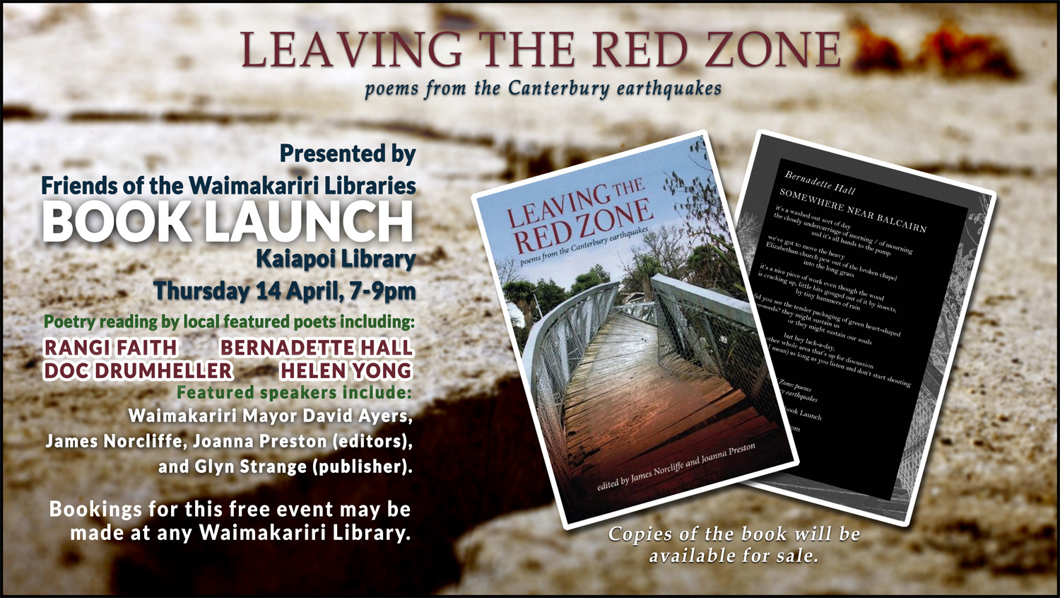Featured speakers include: Waimakariri Mayor David Ayers, James Norcliffe, Joanna Preston (editors), and Glyn Strange (publisher).