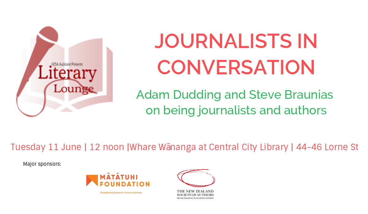 NZSA Auckland Branch is proud to bring you the Literary Lounge Series this June and July.  At the ‘Journalists in Conversation’ event Adam Dudding and Steve Braunias will talk about being journalists and authors in Aotearoa.
