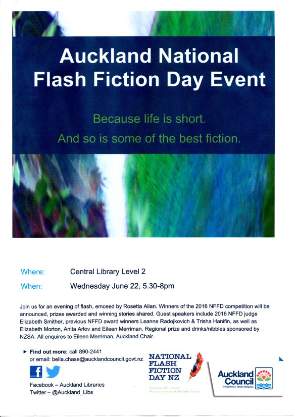 Please join us next week for our National Flash Fiction Day celebrations, occurring 6-8pm in Auckland, Christchurch and Wellington. Judges Elizabeth Smither and James Norcliffe will attend the events in Auckland and Christchurch, respectively, and former NFFD judge Mary McCallum will present prizes in Wellington.