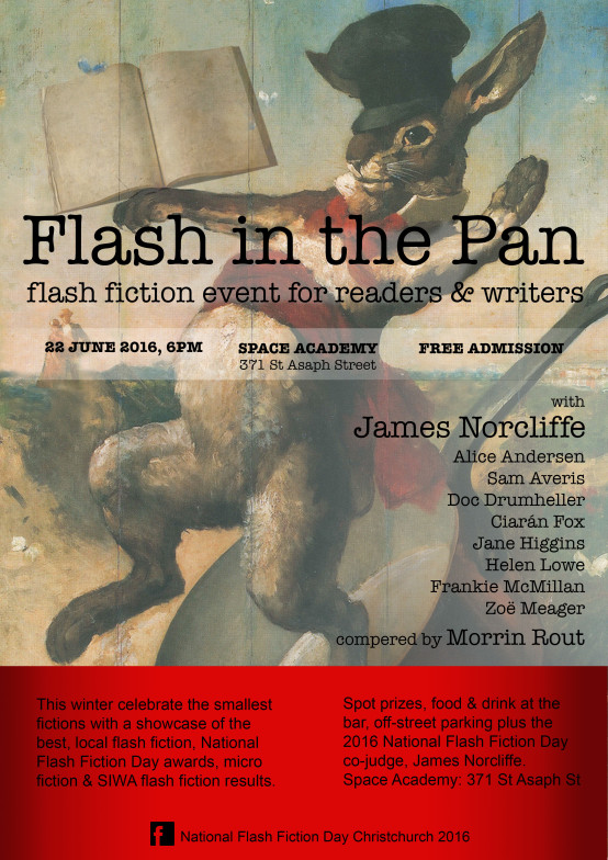 Please join us next week for our National Flash Fiction Day celebrations, occurring 6-8pm in Auckland, Christchurch and Wellington. Judges Elizabeth Smither and James Norcliffe will attend the events in Auckland and Christchurch, respectively, and former NFFD judge Mary McCallum will present prizes in Wellington.