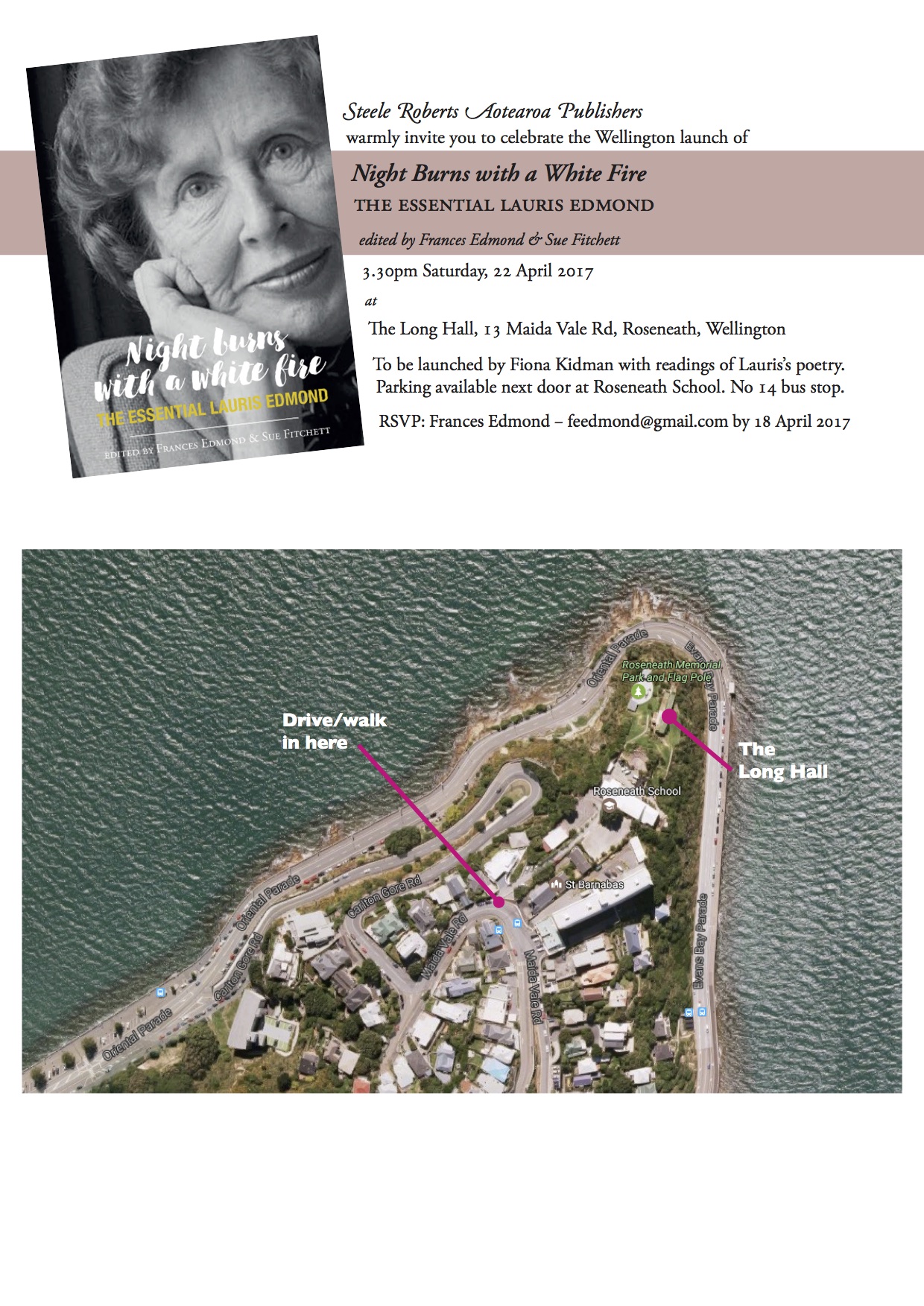 To be launched by Fiona Kidman with readings of Lauris’s poetry. Parking available next door at Roseneath School. No 14 bus stop.