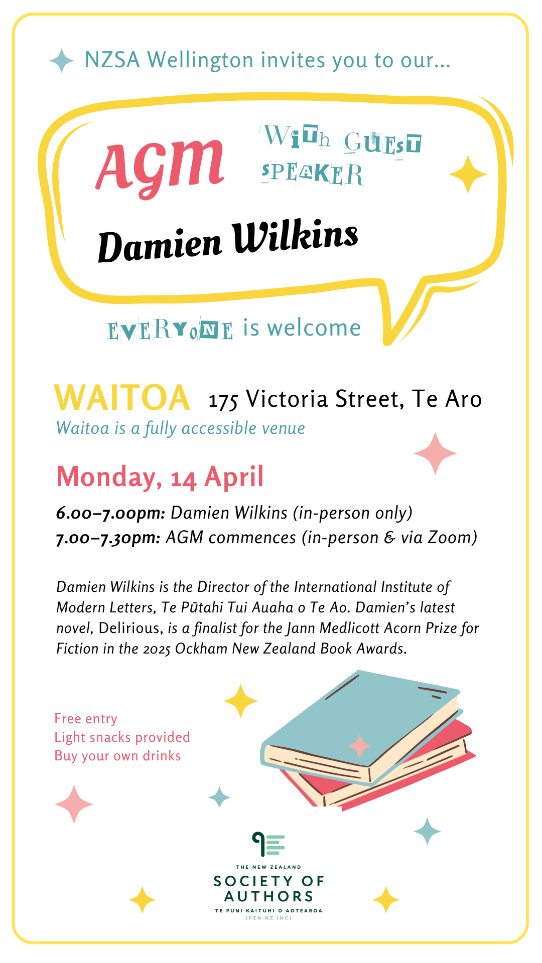 We’re excited to announce that our guest speaker for the evening will be Damien Wilkins, Director of the International Institute of Modern Letters Te Pūtahi Tui Auaha o Te Ao. Damien’s latest novel, Delirious, is a finalist for the Jann Medlicott Acorn Prize for Fiction in the 2025 Ockham New Zealand Book Awards. Read more about Damien here.