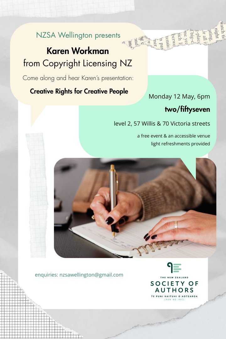 Curious about copyright? Come along on Monday 12 May to our next NZSA Wellington branch event, at a new, accessible venue. Free event, all welcome. Light refreshments provided.