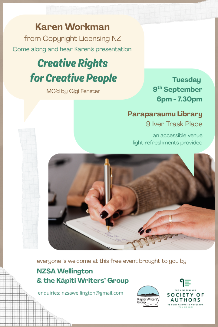 This NZSA Wellington Branch event is held in association with Kāpiti Writers’ Group, with huge thanks to Copyright Licensing NZ.