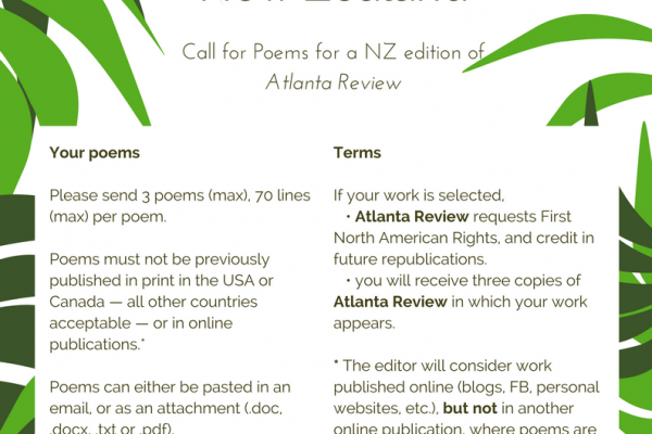 Live in Aotearoa, New Zealand? Have poems? Selected writers receive publication and copies of Atlanta Review (NZ edition) Your poems Please send 3 poems (max), 70 lines (max) per poem. Poems must not be previously published in print in the USA or Canada (all other countries acceptable) or in online publications.* Poems can either be […]