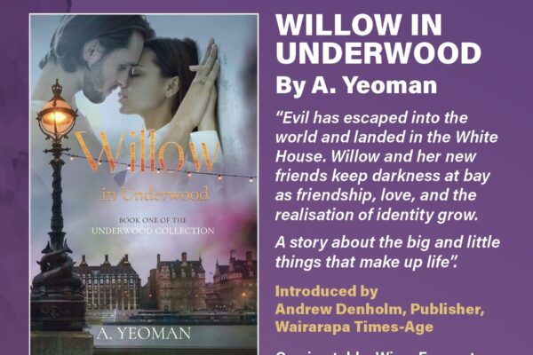 Come to the launch and reading of Willow in Underwood: Book One of the Underwood Collection, by A. Yeoman. Wednesday 30 August, 6:15pm. Almo’s Books, Carterton. Free entry, grazing table, wine, introduction by Andrew Denholm, publisher Wairarapa Times-Age.