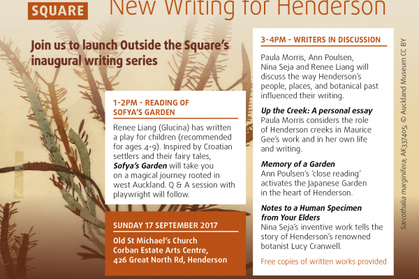 New Writing for Henderson Henderson-Massey Local Board invites you to a free launch event of new writing about Henderson on Sunday 17 September at the Corban Estate Arts Centre. The writing series includes short written works by Paula Morris, Nina Seja and Ann Poulsen , and a theatrical play for children by Renee Liang (Glucina) […]