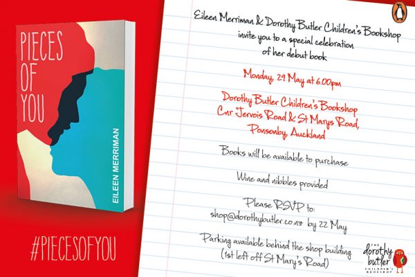 Book Launch for Pieces of You Public. Hosted by The Dorothy Butler Children’s Bookshop and Penguin Books NZ 29 May at 18:00–20:00 Show Map The Dorothy Butler Children’s Bookshop 1 Jervois Road, Ponsonby, Auckland, New Zealand 1011
