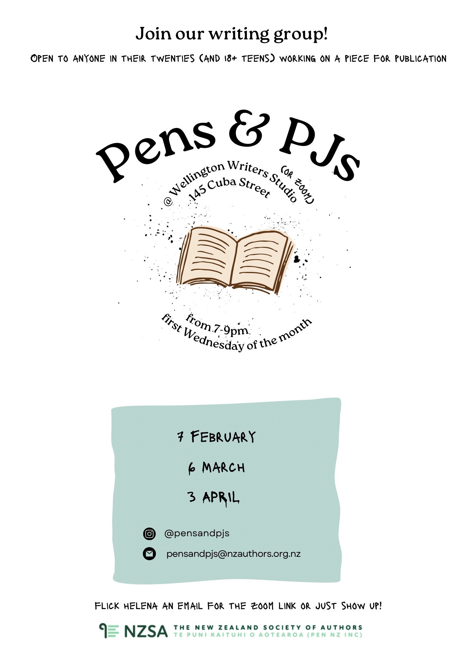 Contact: We’re on Insta @pensandpjs and on email pensandpjs@nzauthors.org.nz
