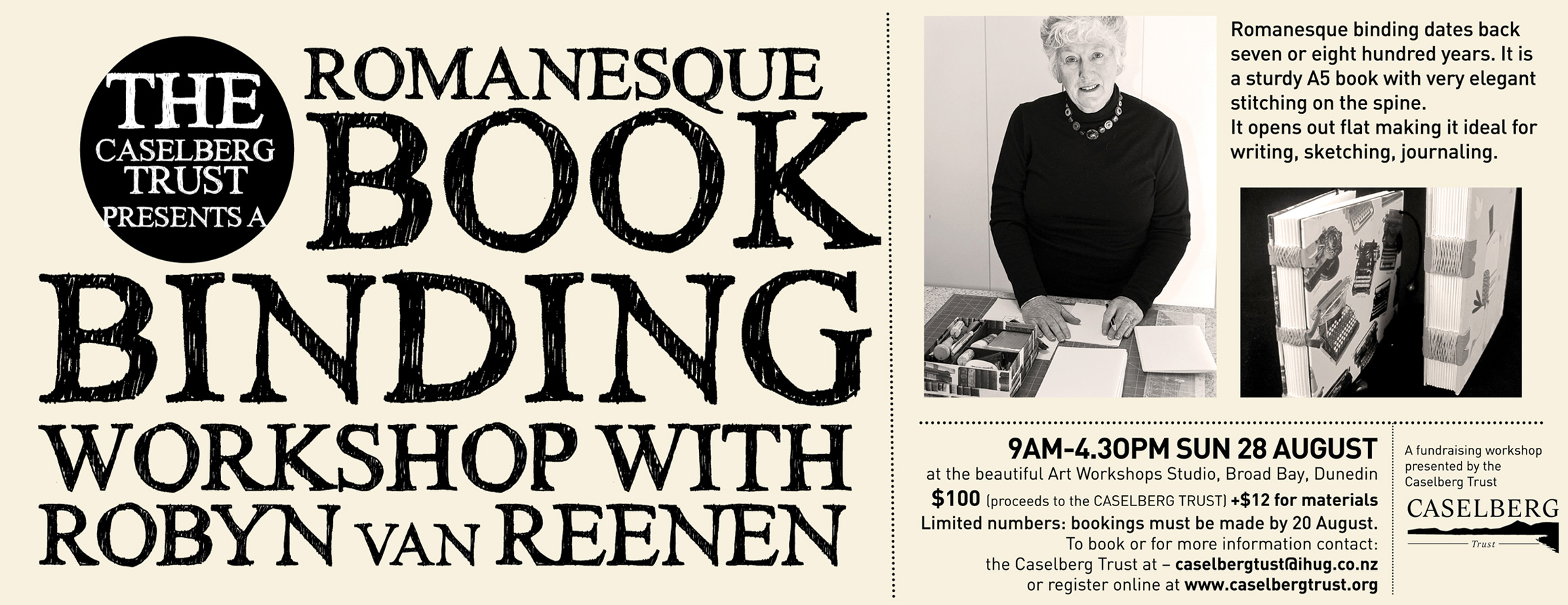 The Caselberg Trust is delighted to be able to offer this fundraising workshop with Wanaka based book binder Robyn van Reenen. Numbers are strictly limited, and so people interested in attending are encouraged to enroll early (bookings by Saturday 20 Augyst). Cost $100 plus $12 for materials, with all profits to the Caselberg Trust to help us continue with our creative arts programme.